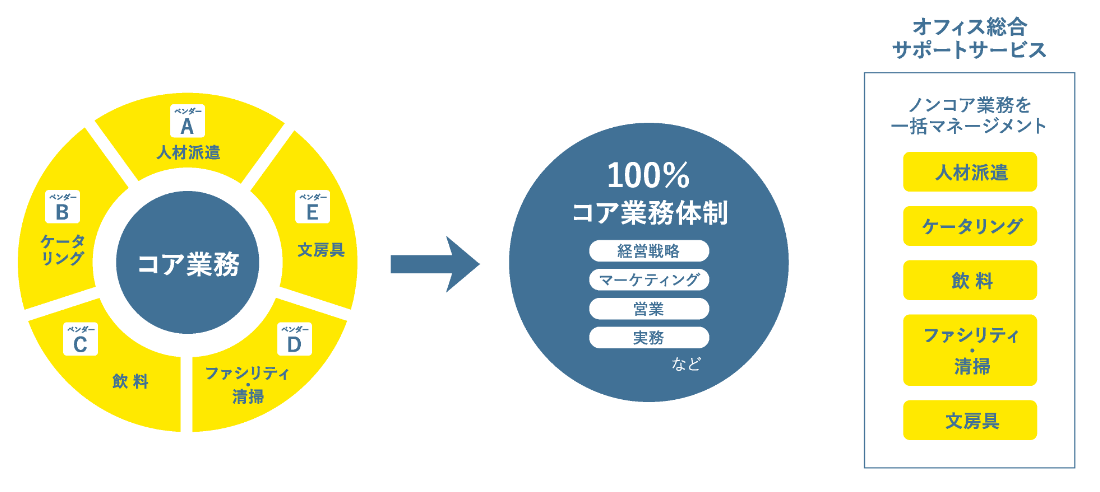 私たちがノンコア業務を「一括してマネジメント」することで、属人的になりやすい総務・庶務業務を可視化し、お客様がコア業務に集中できる職場環境づくりのサポートをいたします。
