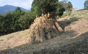 夏にはただの草むらにしか見えない茶草場であるが、秋になるときれいに草は刈られ、刈られた草が束ねられて干してある風景を見ることができます。このような風景は、昔は日本中どこにでも見られた、ありふれた里山の風景でした。 一昔前であれば、農村では、刈った草を肥料として田畑に入れたり、牛や馬の餌にしたり、かやぶき屋根の材料にしていました。 このような人の手によって維持管理されている草地環境は「半自然草地」と呼ばれています。