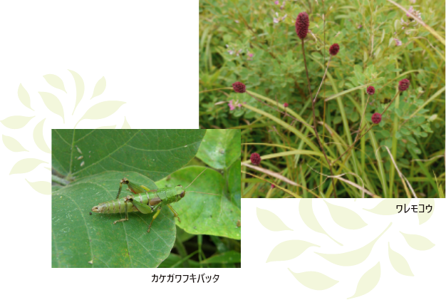 茶草場のある代表的な場所の一つ掛川市粟ヶ岳中腹では、「カケガワフキバッタ」という虫が存在しており、このエリアだけに生息しています。カケガワフキバッタの良好な生息環境を保つためには、「定期的な草刈りと草の搬出で環境の移り変わりの進行を抑制すること」が必要と言われています。